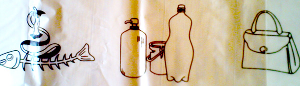 The bags are labeled with descriptions of what goes inside of them. If there is ever confusion, a 7-page comic book explains what goes where and on what days. Special garbage pickup days are also announced by a mysterious figure using bull horns mounted on electrical poles.