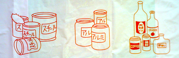 In my town, the canned goods bag is for direct recyclables: Aluminium and glass. The fish skeleton bag is for “burnable” goods, so things like paper, certain kinds of biodegradable plastics and food waste. The Tea Kettle bag is for heavy plastics and metals which can be recycled or need to be destroyed in a special way. The boring green bag is specifically for plastic drink containers (But you have to remove the labels, since the labels are burnable). Cardboard boxes have to be returned to city hall, for some reason.