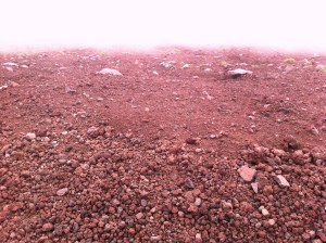You can descend Fuji without falling, but you have to run. The ground slides and carries you about a foot each time you take a step, but you have to work on your next step while you are sliding. The front of your shoes are digging into crushed volcanic ash in the process, and if you are wearing sneakers, the dust and rocks will get in your shoes and socks. Your feet will bleed; you will blister, your skin will burn for a day or two.