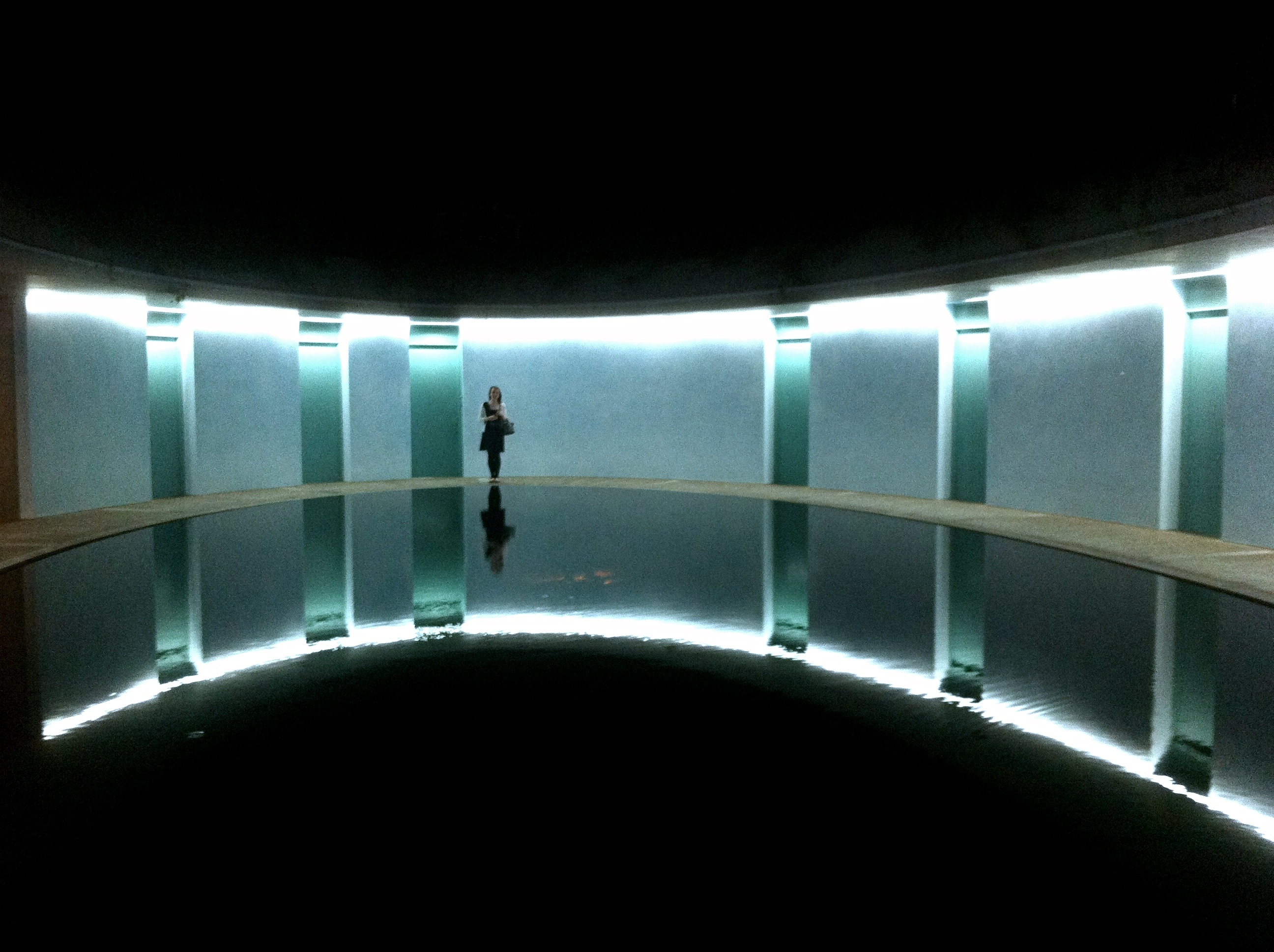 We were led into a pitch black room, unable to see our hands in front of our faces, and told to sit down. Slowly, as our eyes adjusted to the darkness, we could see that there was a screen in the center of the room, as if it were a film projection. Over 15 minutes, it seemed as if the screen were getting brighter, but in fact the light in the room had never changed. Again, this projection was actually a small rectangular space filled with water vapor.