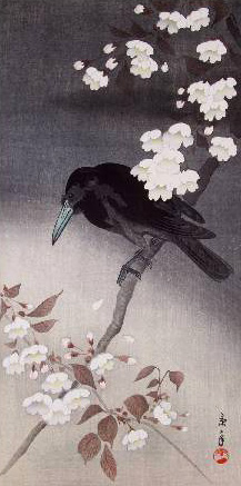 crowrightCrows, too, went up and down; attracted with their noise and spastic soaring an amused irritation. But one particular ukiyo-e, of a crow perched silently on a branch, black plumage peeping through cherry blossoms, revealed something I felt as well, a still center that went unseen in all other outward iterations. I got it tattooed on my shoulder ten days before I left Japan, as a reminder of a core that did not move.