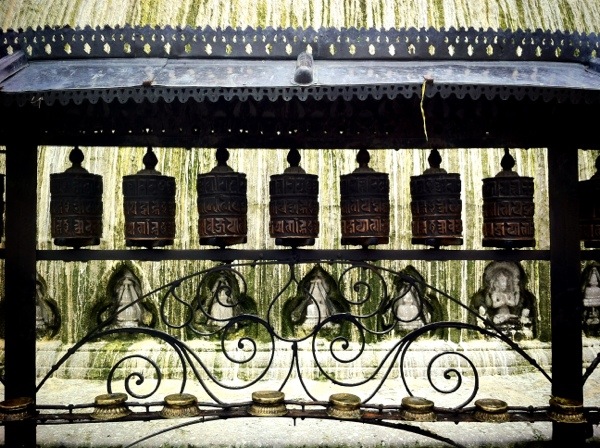 They spin like miniature prayer engines, contributing to the aura of the stupa – millions of hands have spun them before me, had their hands encrusted in the rubbed-off copper and birdshit that cover the wheels. I stop, and three women in robes pass by, spinning the ones I’ve already spun and continuing the circle around to where I would have gone.